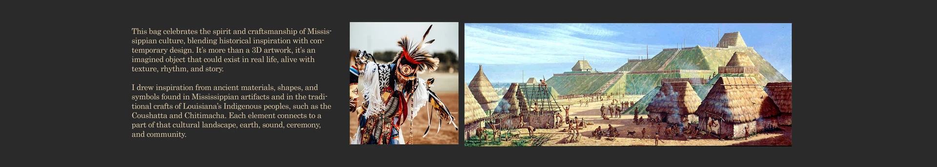 A 3D conceptual design of a handcrafted golf bag inspired by Indigenous art and landscapes of Louisiana. Combining woven cane, feather, shell details, and organic textures, it reinterprets Mississippian symbolism through contemporary design.